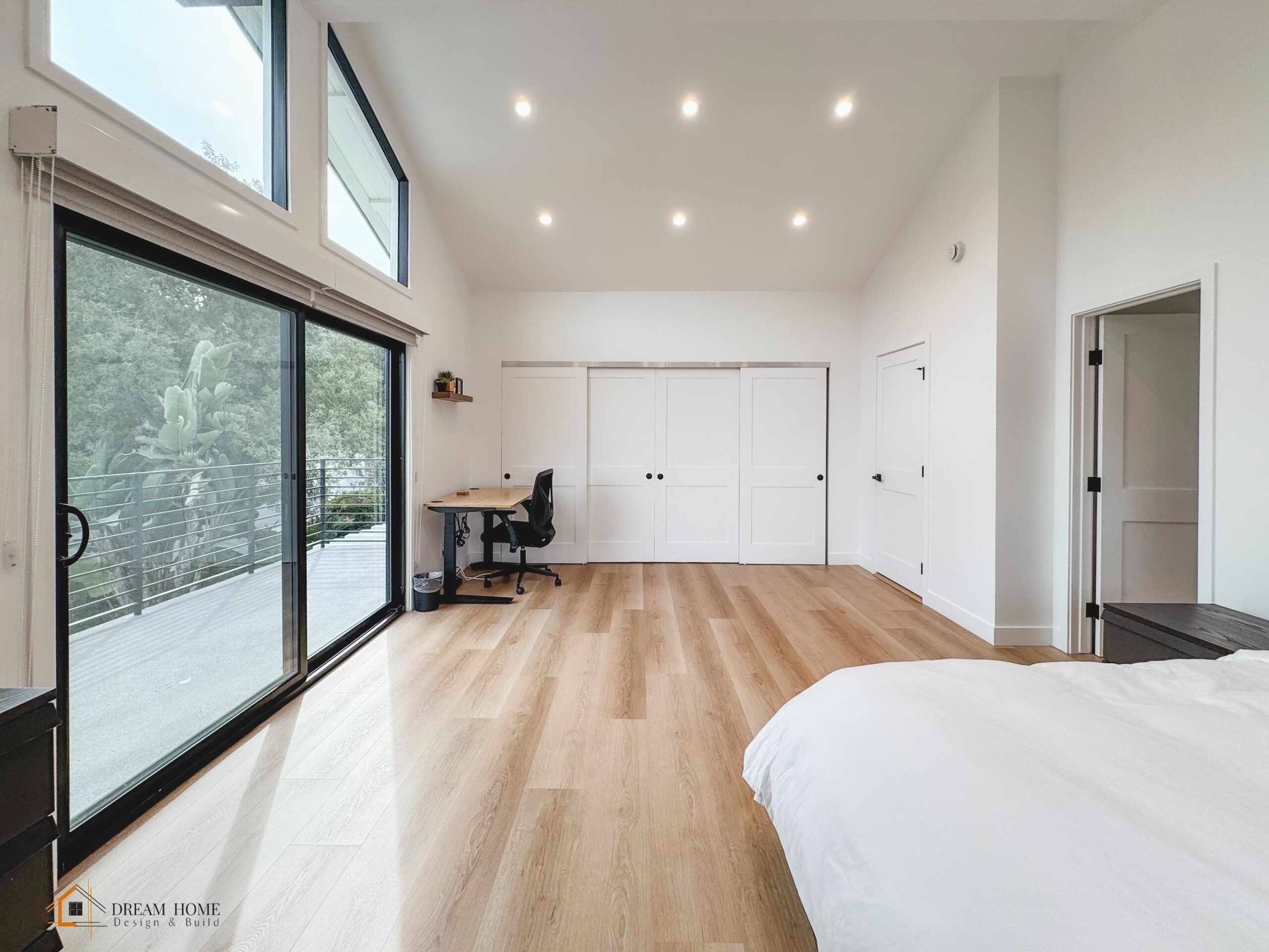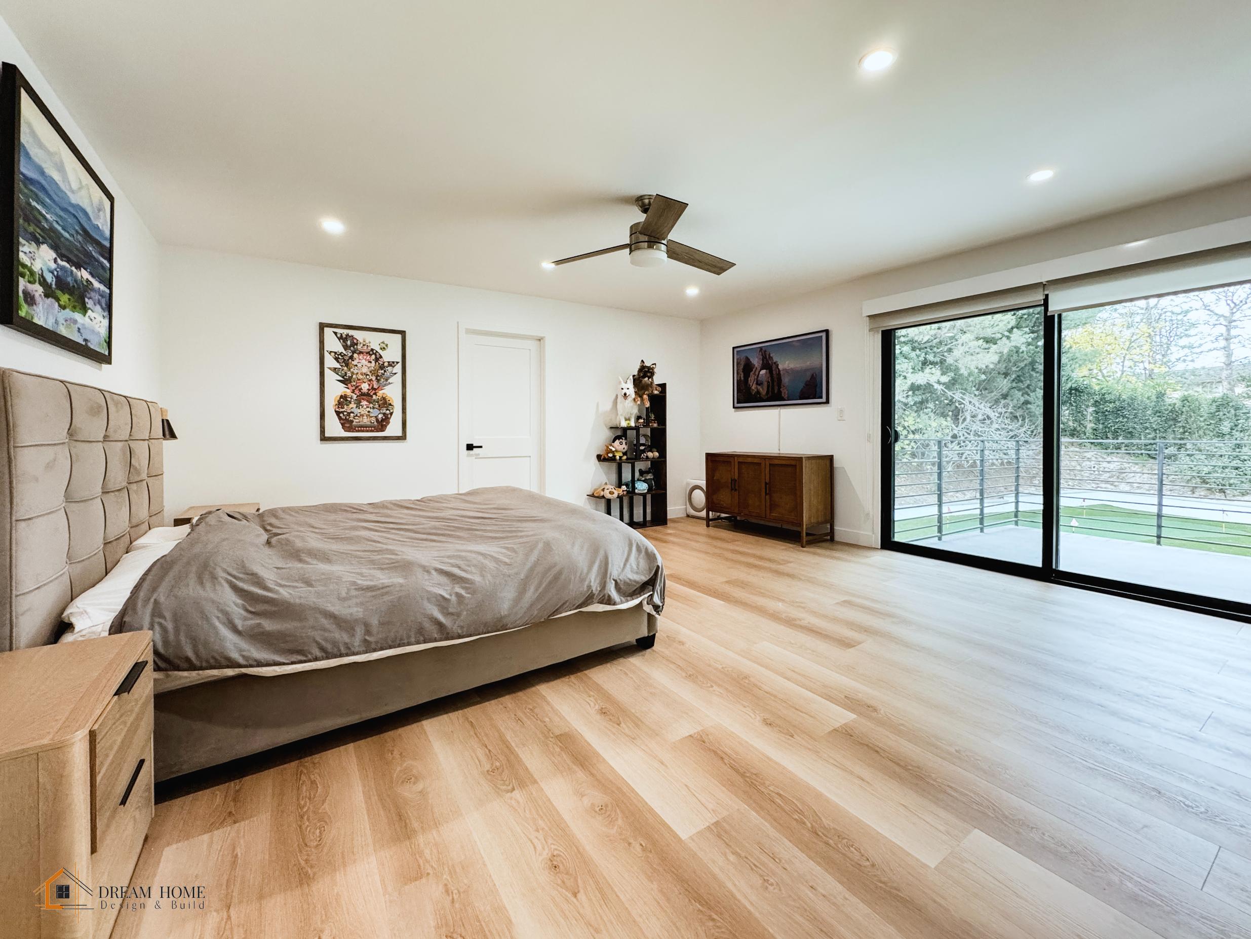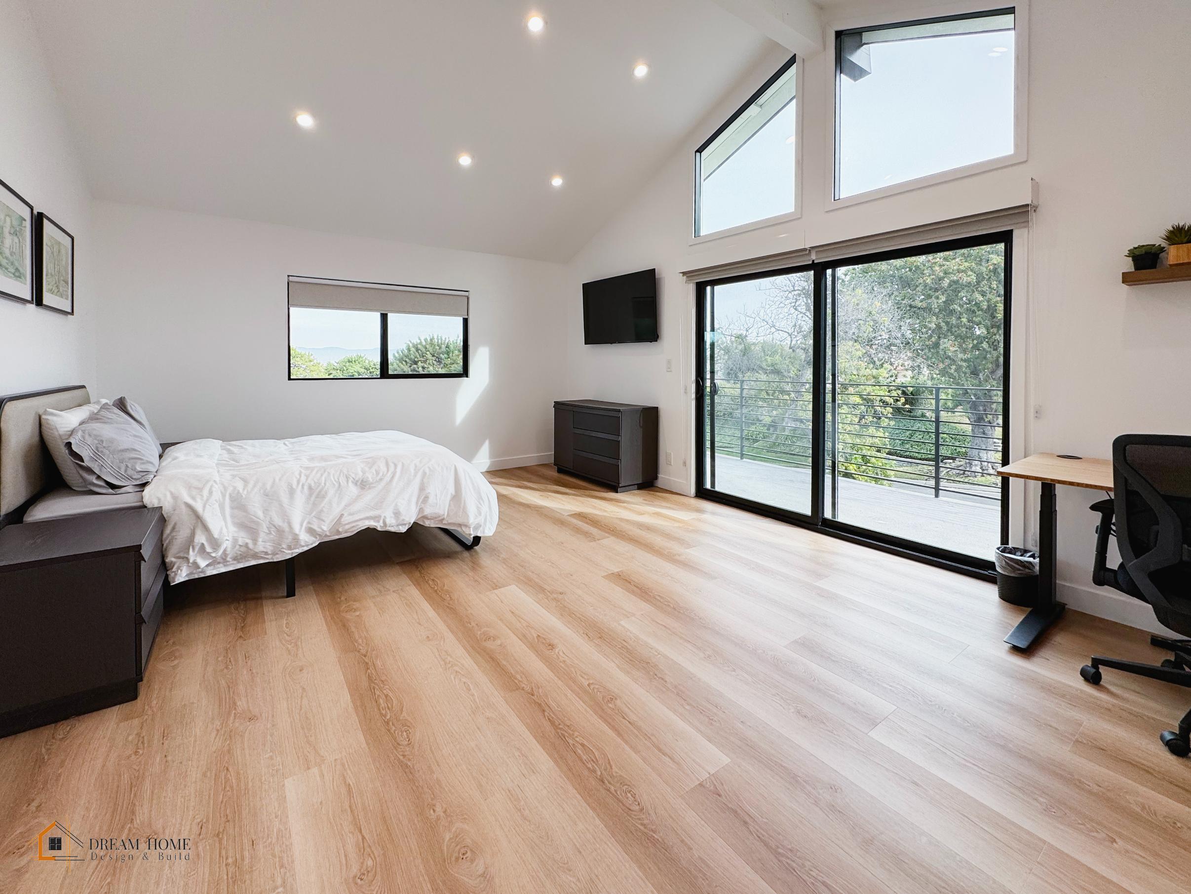 Raymond and Renee’s home was reimagined into a modern and luxurious living space through a comprehensive remodel. The exterior boasts a sleek, contemporary look with updated windows, railings, and a stunning pool area featuring a geometric design and integrated landscaping.