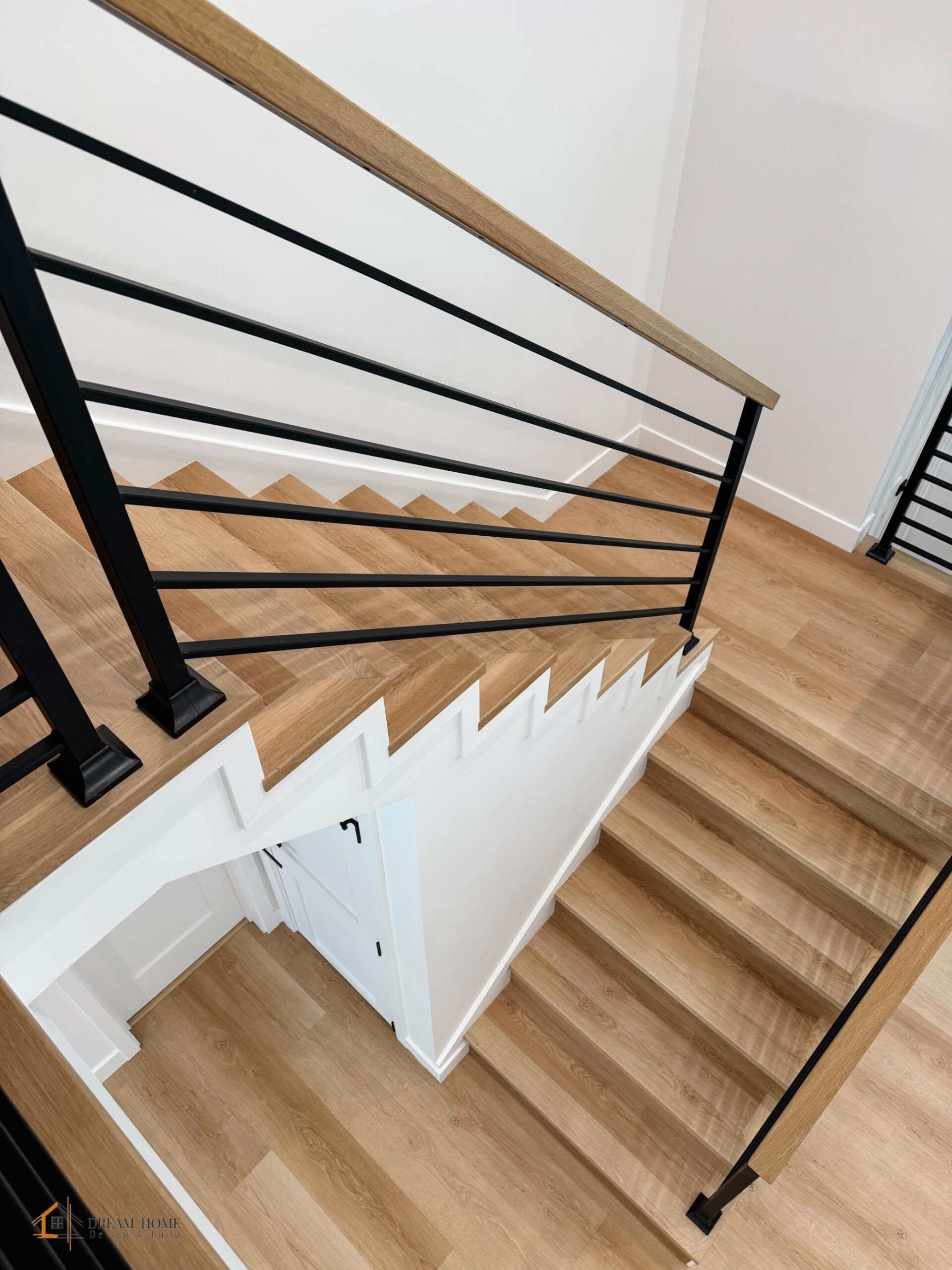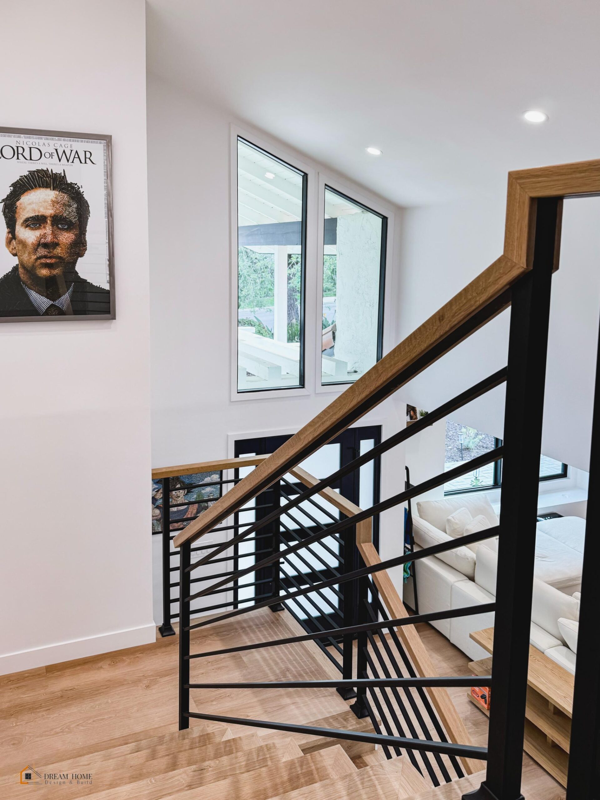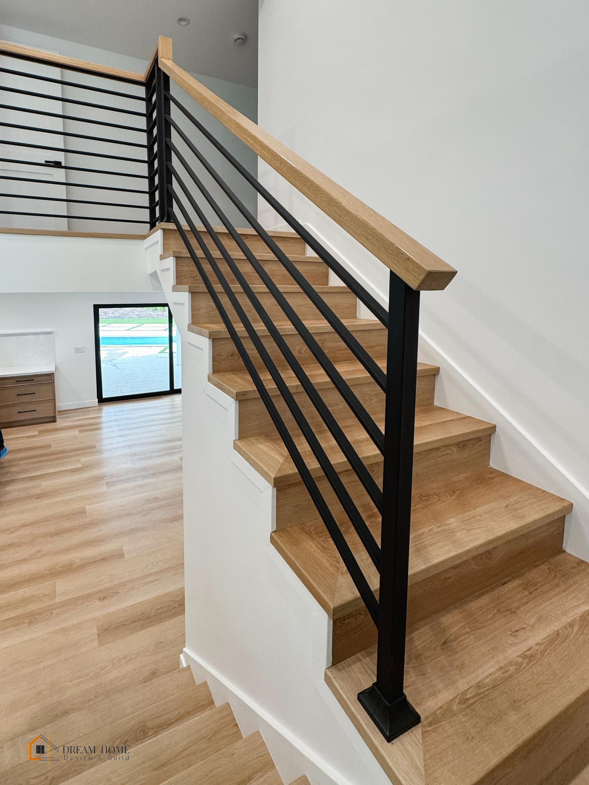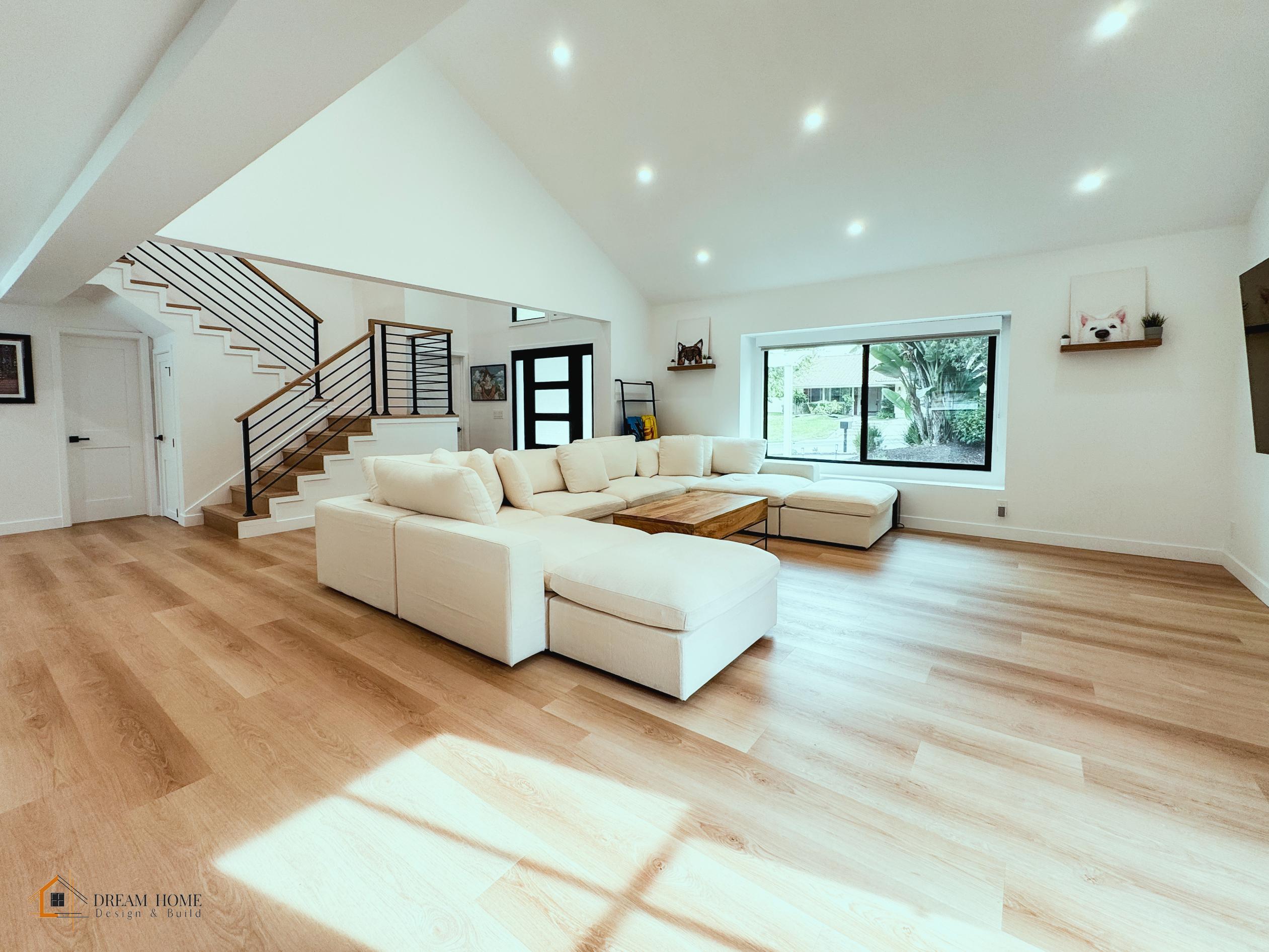 Inside, the home now features an expansive open-concept layout with light wood flooring throughout. The kitchen is a chef’s dream, with custom cabinetry, high-end appliances, and a large island that serves as the centerpiece for entertaining. The living area exudes warmth and elegance, enhanced by natural light and a modern staircase with wood and metal accents.